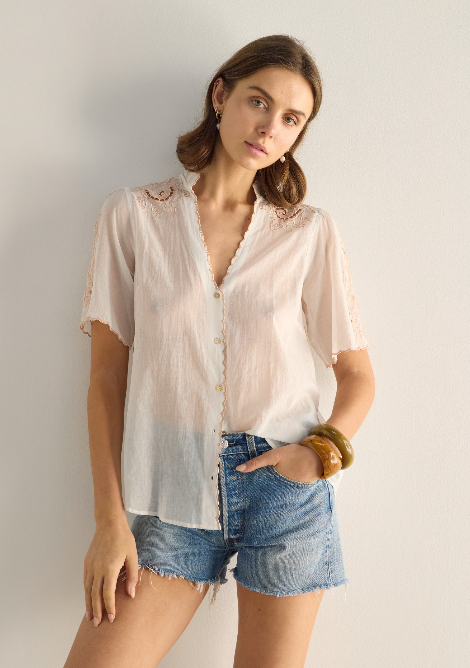 The Alba Embroidered Blouse is a true masterpiece, crafted from soft off white organic cotton by our talented artisans. Designed with a collar stand, V neckline, and button-front closure, it’s finished with intricate hand embroidery of intricately placed florals, alongside delicate scallop detailing. A beautifully considered piece made to be treasured.