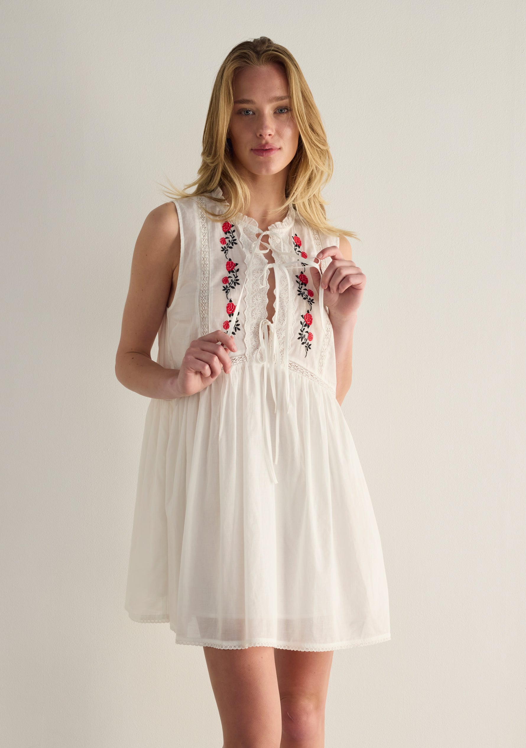 The Bellamy Mini Dress in white, with contrast hand-embroidered red roses, is your playful summer essential. Designed in a super-flattering babydoll silhouette, no detail has been spared—intricate embroidery, delicate pin tucks, lace touches, and functional ties—crafted from deliciously soft organic cotton. A sweet, artisanal piece made to brighten every warm day.