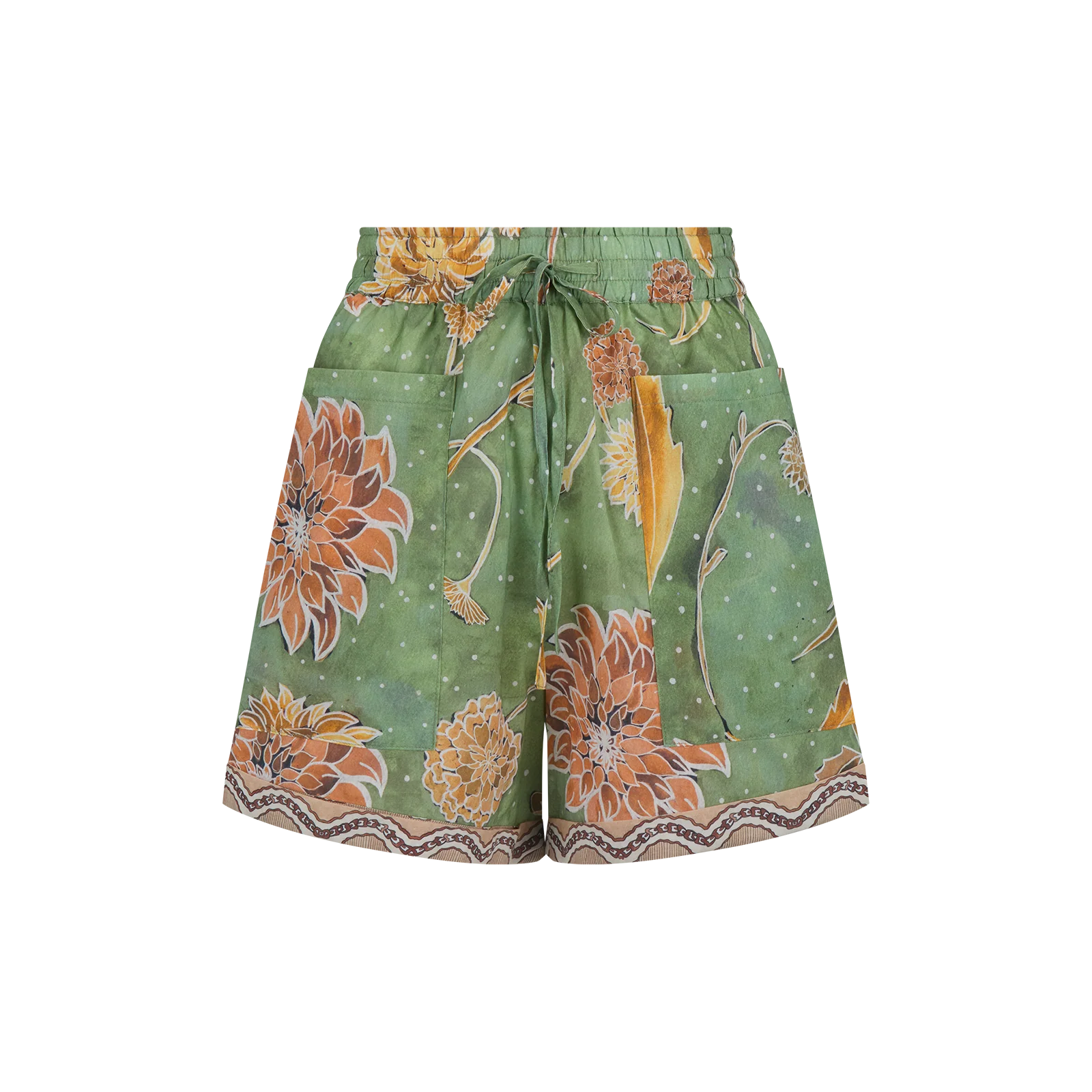 The Dahlia Shorts feature soft, hand-painted dahlias set against a leafy green base inspired by the romance of English gardens. Lightweight, organic cotton designed for warm days with a relaxed fit.