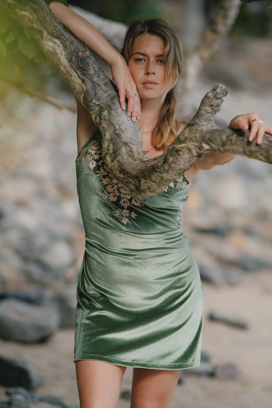 This stunning mini dress, now reimagined in the lush Moss hue, is crafted from luxurious silk velvet that glimmers softly with every movement. The neckline is beautifully detailed with handcrafted embroidery, offering a striking balance of earthy allure and vintage inpired refined elegance.
