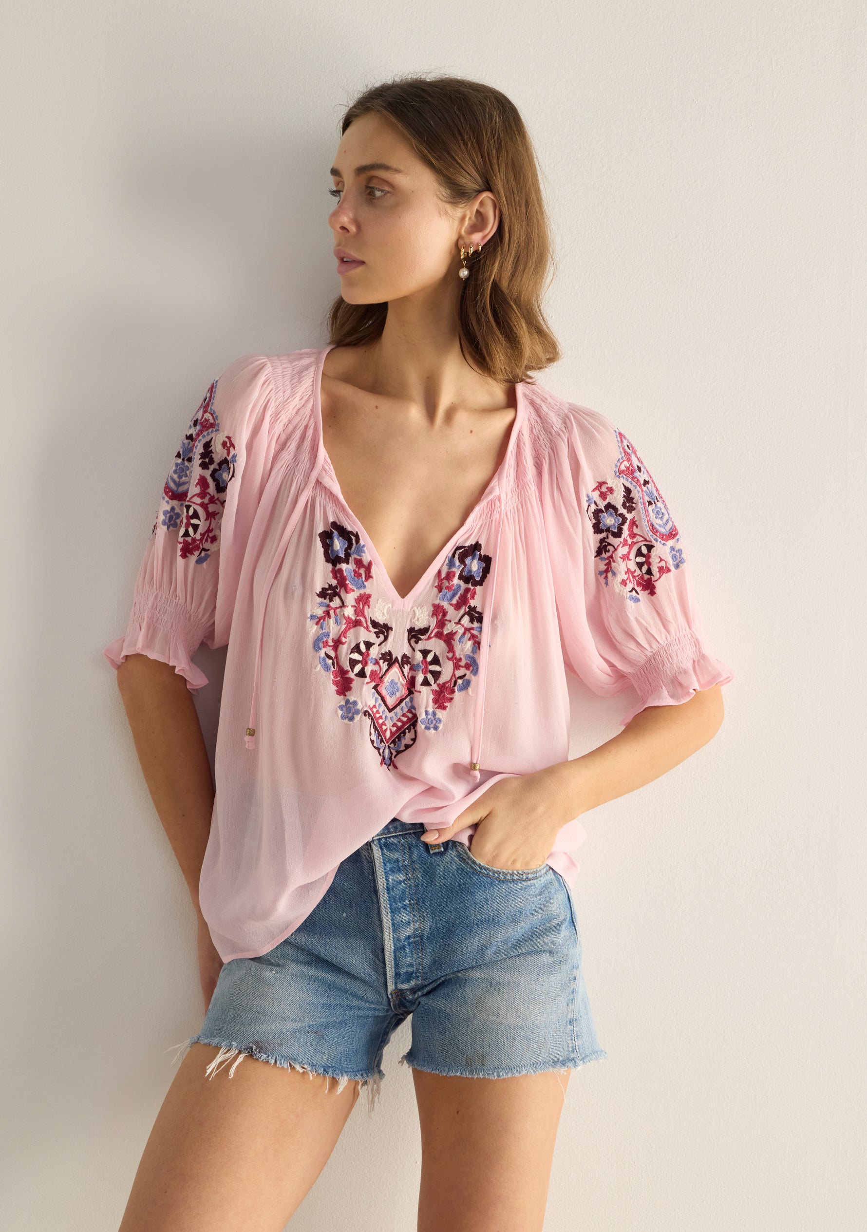 The Indra Embroidered Blouse in pastel pink is a dreamy artisan piece, adorned with contrast hand embroidery. Designed with a V-neckline and optional tie, soft shirring, and raglan puff sleeves with elastic cuffs, this semi-sheer georgette style is effortlessly feminine—your denim’s new best friend.