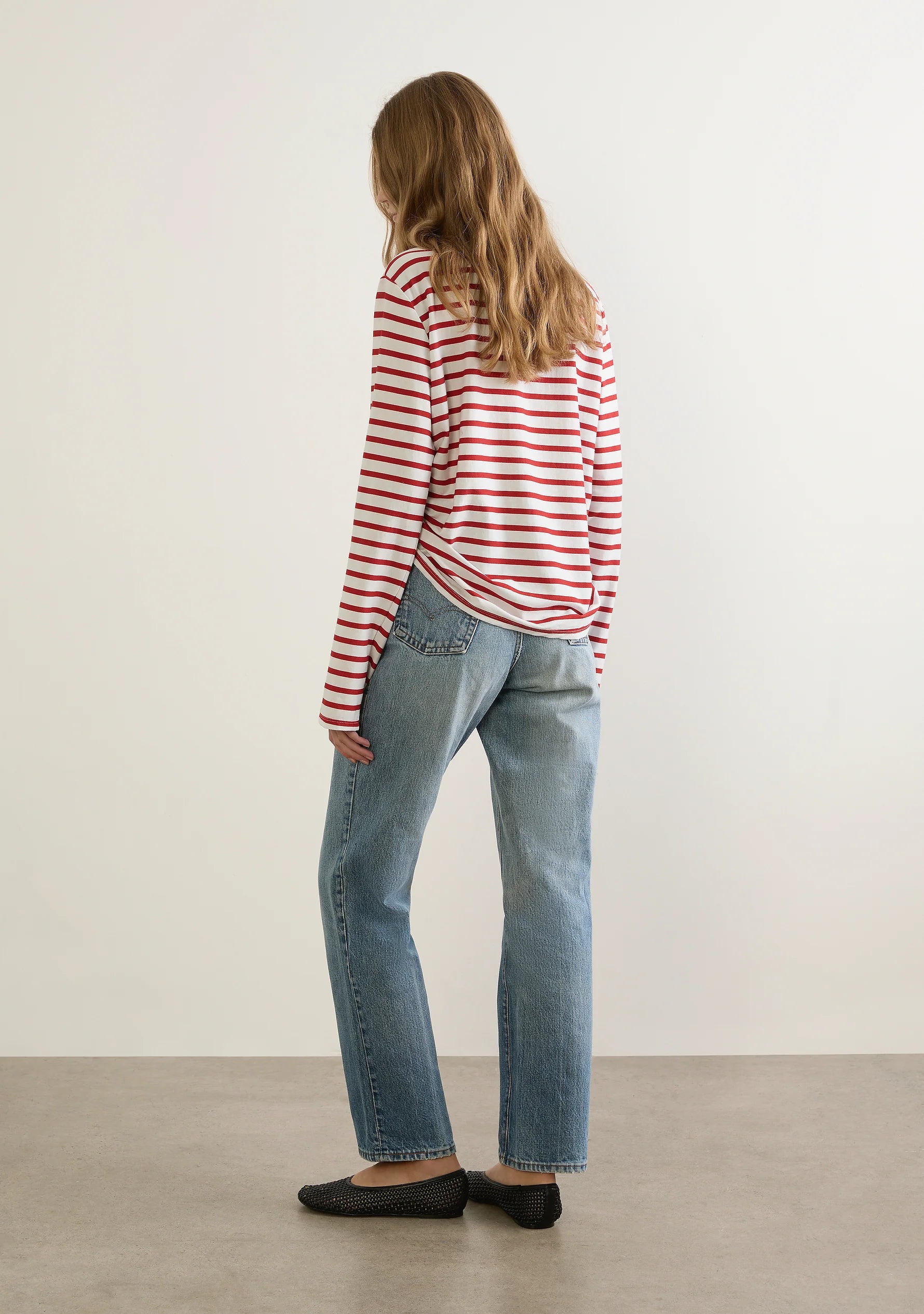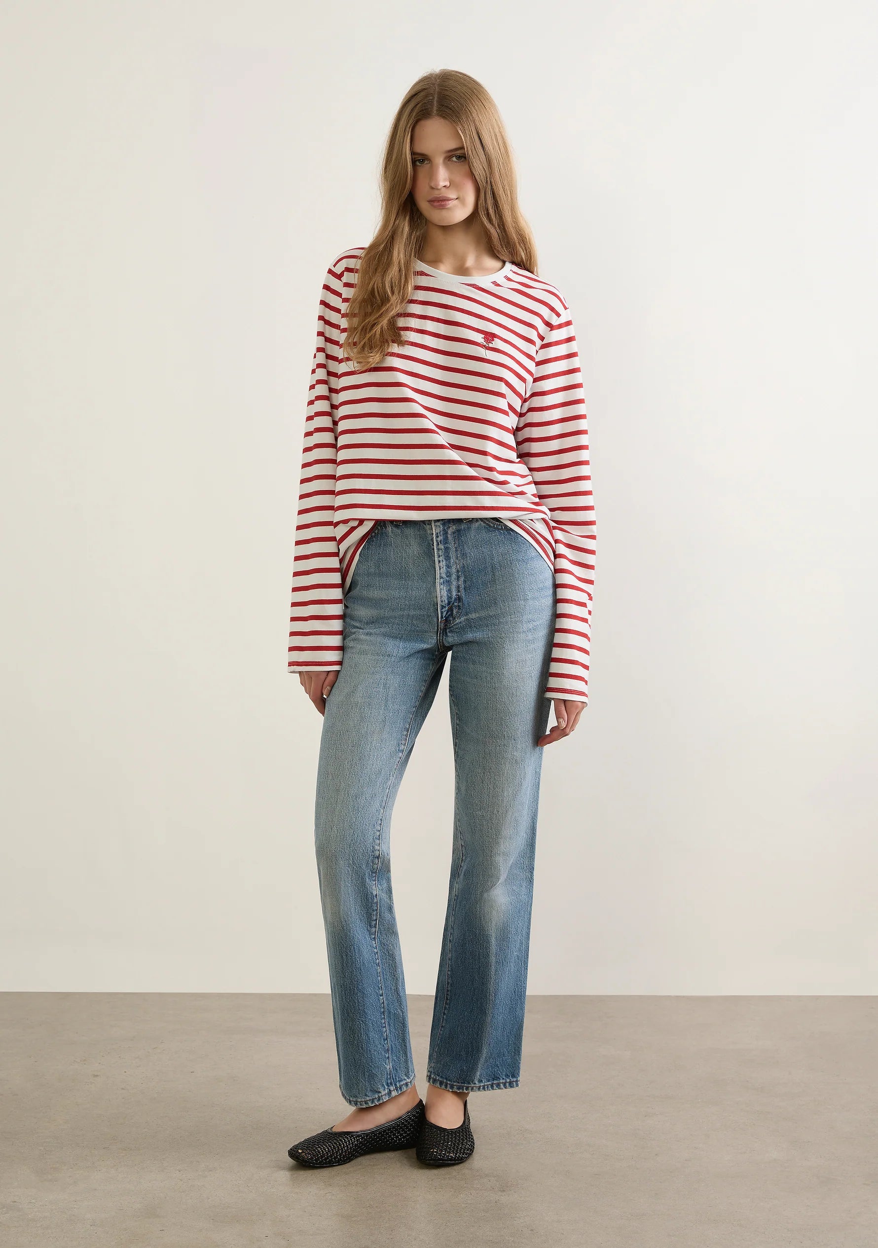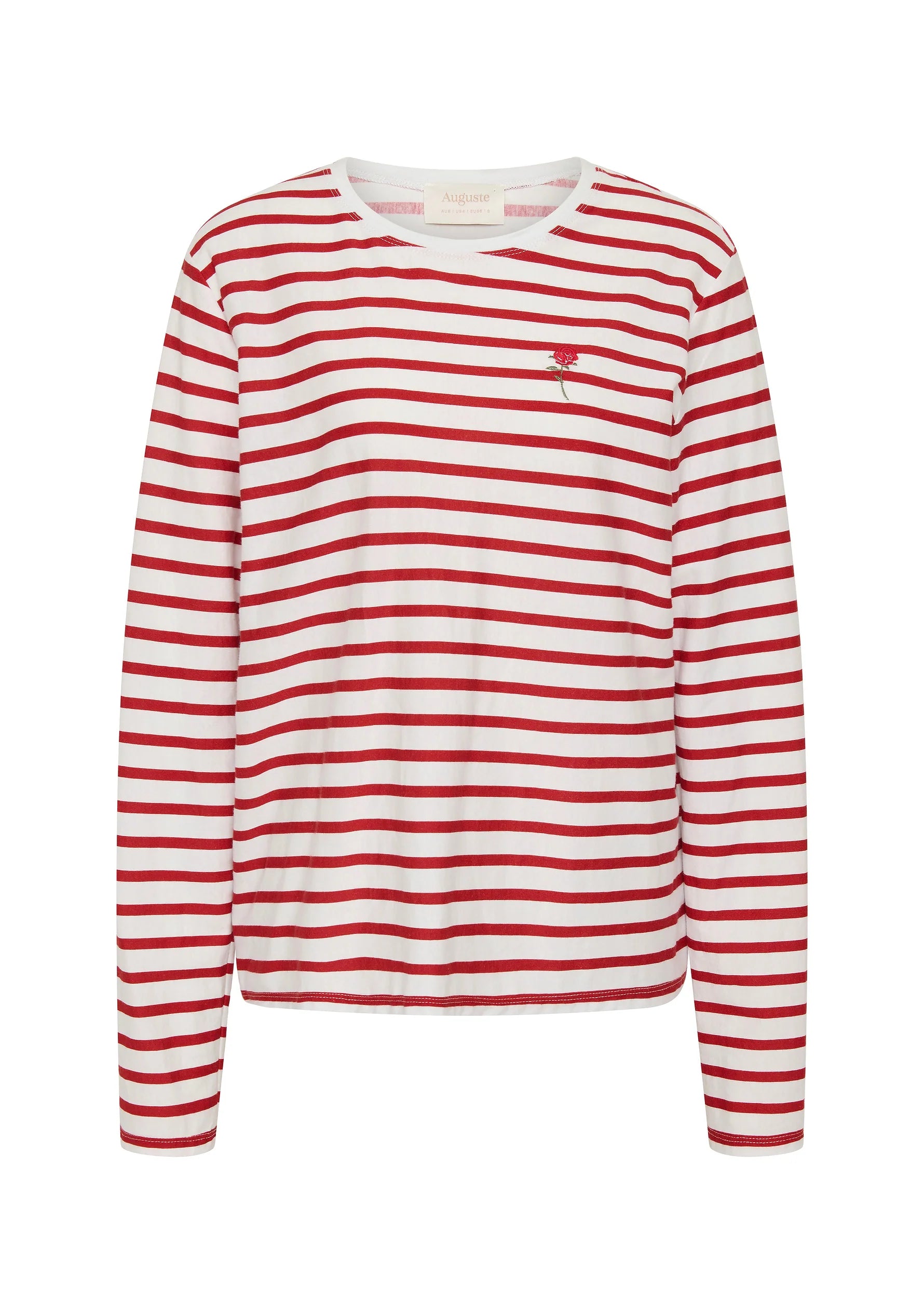 The North Long Sleeve Tee in red and white classic stripe is crafted from crisp cotton jersey with a printed stripe and soft, lightweight feel. Designed with a timeless crew neckline and long sleeves, its effortless silhouette is elevated by our signature embroidered rose — an Auguste trademark. Easy and versatile, North offers a relaxed yet refined fit for everyday wear.