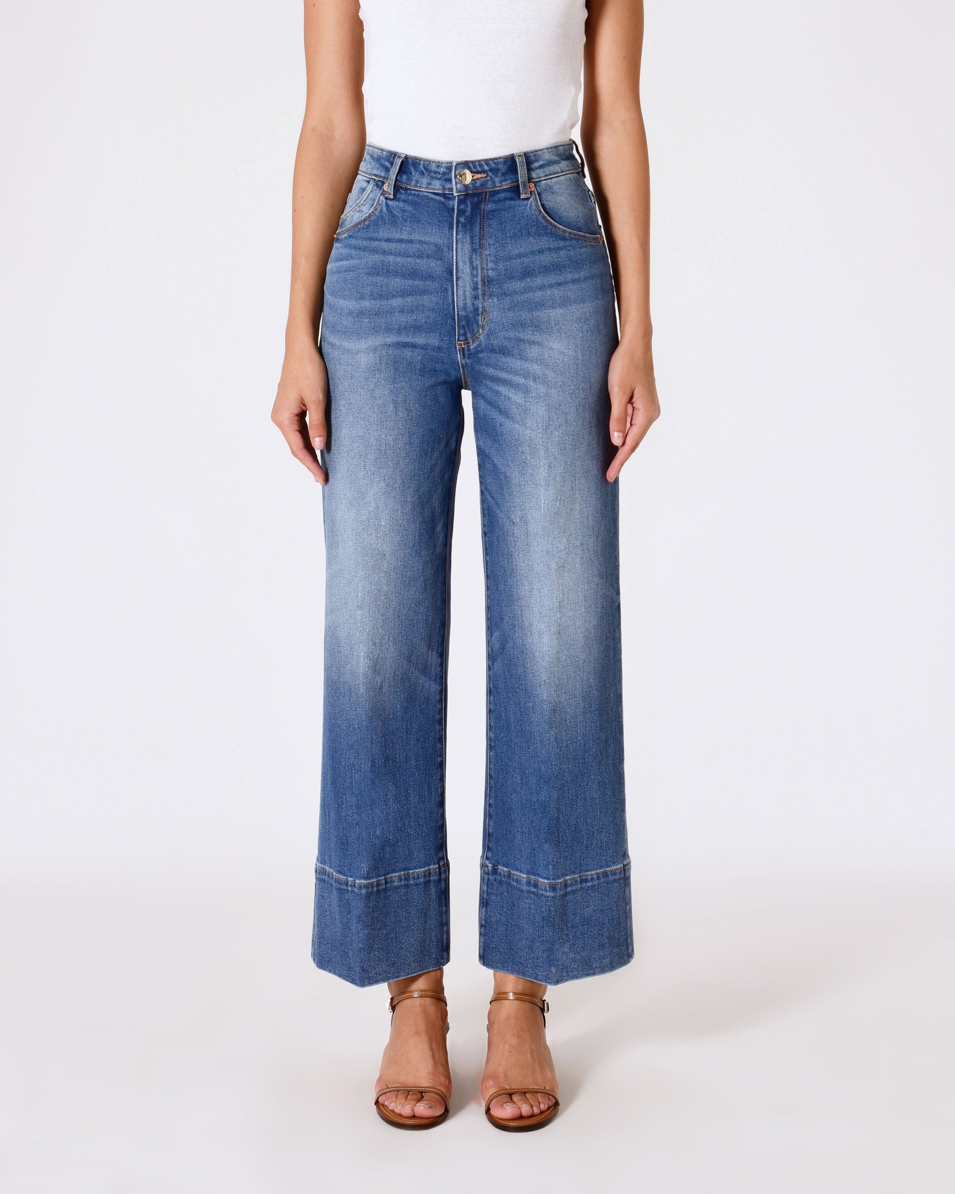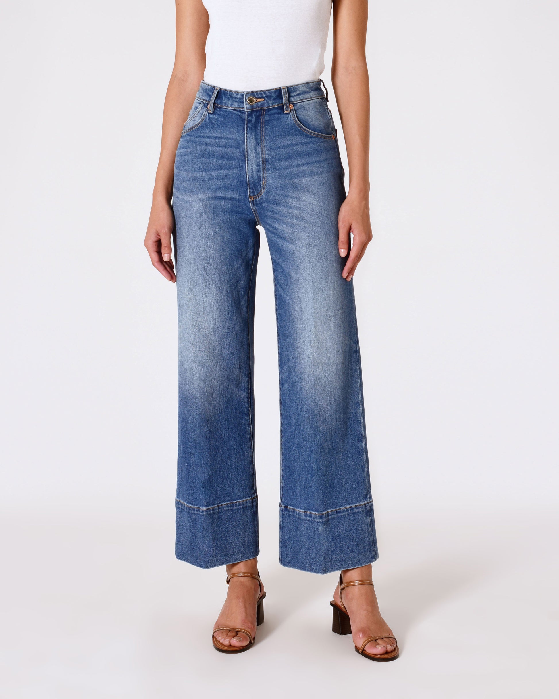 This is a super high-rise, wide leg jean, made with a non stretch denim. Fits true to size.